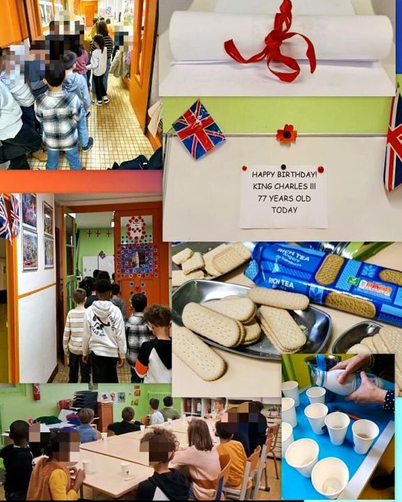 Julie, notre professeur d'Anglais , a invité les élèves à un "Tea and biscuits " en l'honneur des 77 ans du roi Charles III.